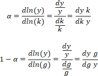Sabemos que (dln(y)/dy)=1/y; por ende, dln(y)=dy/y; asimismo,(dln(k)/dk)=1/k y (dln(g)/dg)=1/g; por lo cual podemos establecer con claridad las elasticidades respectivas a estos dos factores: