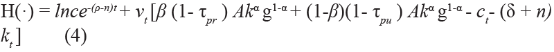 (13)La ecuación (13) muestra que la relación de la tasa de crecimiento con las tasas impositivas es no lineal, al igual que en Barro (1990); esto se debe a que un aumento en las tasas impositivas reduce el ingreso disponible y, por tanto, el ahorro y la inversión privada. Por otro lado, las mayores tasas impositivas implican una inversión pública más grande y, en consecuencia, se incrementa la productividad del capital privado, con lo que aumenta la inversión privada.