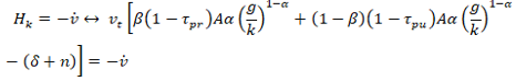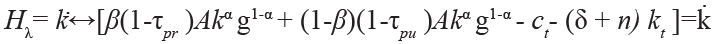(8)Después de aplicar logaritmos a Hc, de derivar con respecto al tiempo y sustituir en Hk se obtiene la condición de crecimiento del consumo, proporcional a la diferencia entre la productividad del capital, del gasto después de impuestos, la depreciación y la tasa de crecimiento poblacional: