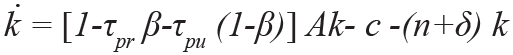 La restricción presupuestaria implica que la producción obtenida menos la otorgada al gobierno mediante impuestos es repartida entre el consumo (ct), la inversión neta (k)̇, más la depreciación del capital, considerando el crecimiento poblacional (δ + n) kt, donde δ es la tasa de depreciación del capital, con lo que se tiene: