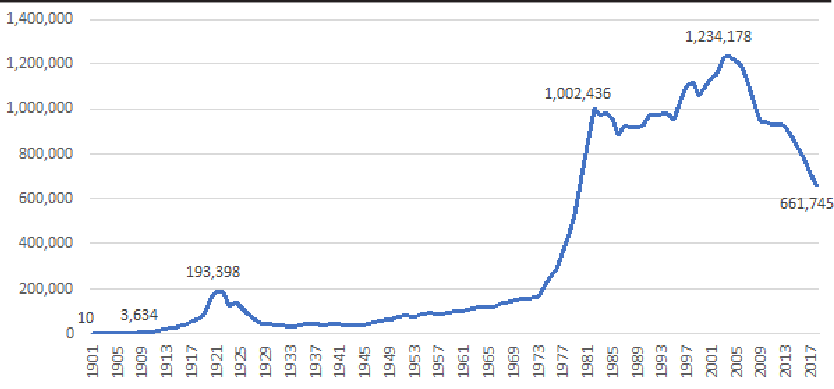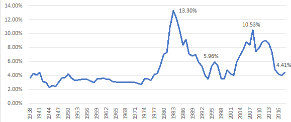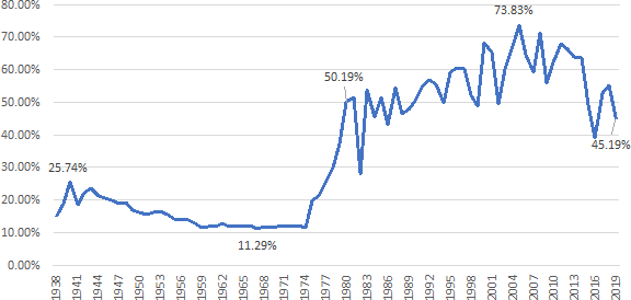 Los montos pagados por Pemex como impuestos (derechos) respecto a sus ingresos o ventas tienen claramente tres periodos: uno desde 1938 hasta 1974, con una baja participación promedio de 15.40%. En los dos últimos años del sexenio 1970-1976 se presentaron cifras muy cercanas a 20%, es decir, uno de cada cinco pesos de los ingresos de Pemex fue entregado a la Federación. El tercer periodo abarca desde 1977 hasta 2018, con valores promedio del pago de impuestos3 de 55.67% de los ingresos totales de Pemex. En otras palabras, uno de cada dos pesos que genera Pemex lo entrega al gobierno federal (Gráfica 4).