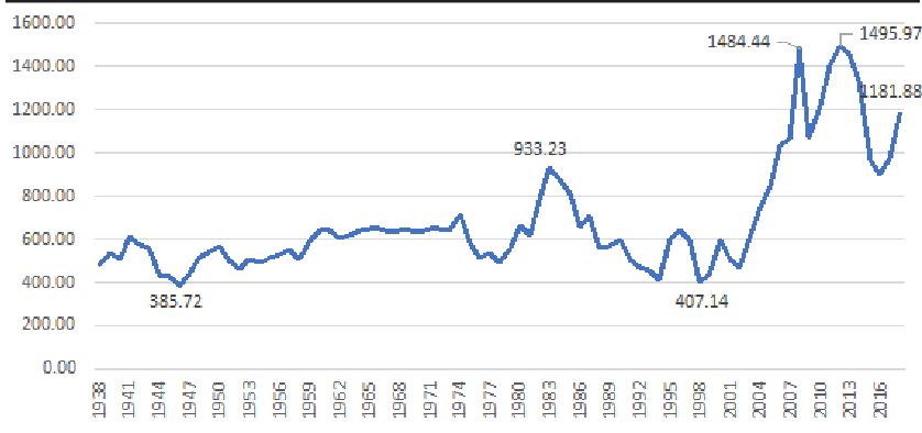 El precio del barril de petróleo, en términos reales a pesos constantes de 2013, entre 1938 y 1982 se mantuvo por debajo de los 800 pesos, aunque un máximo de este precio en ese periodo se presentó en 1983 con un monto de 933.23 pesos por barril. En 2012 y en 2008 fueron registrados los máximos históricos, con precios de 1,495.97 pesos y 1,484.44 pesos por barril, respectivamente (Gráfica 2).