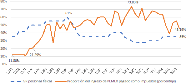 Entre 1970 y 2018, el aumento en la proporción de los ingresos petroleros entregada como recaudación fiscal estuvo acompañada de una disminución en la tasa del Impuesto Sobre la Renta (ISR) a personas físicas: la tasa de ISR máxima fue en 1986 (61%), pero desde 1989 la proporción pagada fiscalmente a la federación con respecto a los ingresos petroleros fue superior a la tasa del ISR (Gráfica 5).