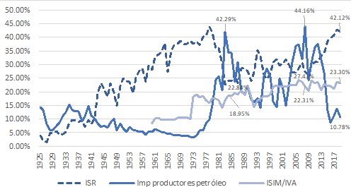Por su parte, la importancia de la recaudación del ISR en los ingresos tributarios y no tributarios tuvo una dinámica de ascenso, desde 1925 hasta 1979, de 4.04 a 43.98%, con un descenso en 1982 a una participación de 22.84%, que en 2019 fue de 42.12 por ciento.