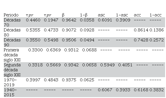 El segundo escenario (columna 3) se calcula a partir de una β que, dado los valores de α, β y τpr, permitieran tener una política fiscal de tasas impositivas diferentes y óptimas en la década de los setenta. Se muestra que esto sería posible si α fuese de 0.55, en cuyo caso la (τpu ) óptima sería de 0.557731844. No obstante, se observa que si α fuese de 0.55 y con la política fiscal vigente en esa década, la pérdida en el crecimiento sería mínima.