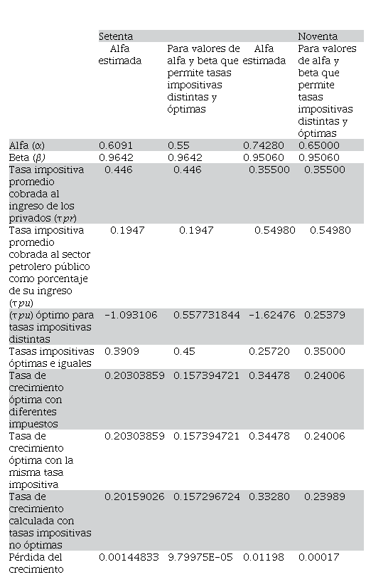 Tomando en cuenta los valores descritos en el párrafo anterior, en el Cuadro 1 se estiman las tasas impositivas óptimas e iguales que, de acuerdo con la ecuación (14), equivalen a la elasticidad gasto público per cápita-PIB per cápita (fila 6). La tasa impositiva óptima para el sector petrolero público, diferente a la tasa impositiva cobrada al sector privado (fila 5), se calcula usando el valor de la tasa impositiva promedio pagada por el sector privado (fila 4) y la ecuación (14). Una vez calculadas las tasas impositivas óptimas se calcula la tasa de crecimiento óptima y se sustituyen las tasas impositivas óptimas en la ecuación (13) para cuando las tasas impositivas óptimas son diferentes (fila 7) y para cuando son iguales (fila 8). Como es de esperarse, las tasas de crecimiento óptimas son iguales en ambos casos. Posteriormente se calcula la tasa de crecimiento con las tasas impositivas promedio observadas en la década estudiada (fila 9). Finalmente se estima el costo de seguir una política fiscal no óptima en el crecimiento (fila 10) y para ello se le resta a la tasa de crecimiento óptima, la tasa de crecimiento con las tasas impositivas promedio observadas en la década estudiada, lo que da como resultado de la sustracción los puntos en crecimiento perdidos por no tener una política fiscal óptima.