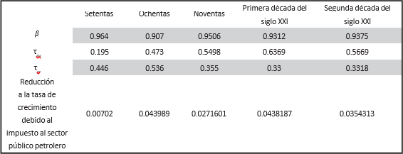 Como en el ejercicio anterior, los valores de β, τpu y τpr son los valores promedios observados en su respectiva década. La tabla sugiere que los impuestos cobrados al sector petrolero público y gastados exclusivamente en consumo redujeron la tasa de crecimiento de la economía de forma importante, por lo que se observa un mínimo en la década de los setenta (0.7%) y un máximo en la década de los ochenta (4.39%).
