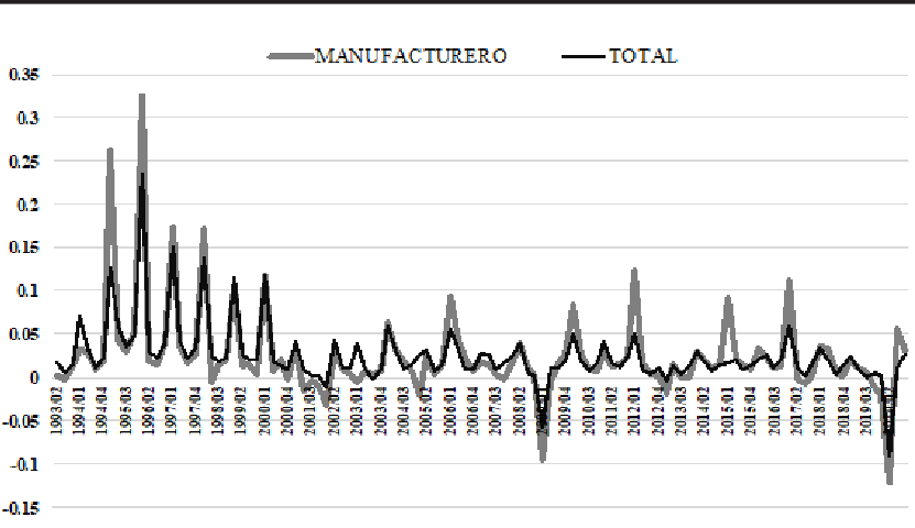 Otros indicadores4 también son incorporados en el análisis a través de variables estándares en la literatura, considerados para robustecer el modelo y que indirectamente sirven como variables que “generan” confianza y certidumbre al momento de tomar decisiones. Éstas son consideradas de carácter control, pues es sabido que la actividad indus- trial responde a una serie de medias micro y macroeconómicas, que no son el objetivo primordial de este análisis. Estas variables influyen, pero no determinan el desempeño de la industria manufacturera desde la perspectiva utilizada, por ejemplo, la tasa de interés, el tipo de cambio o índice nacional de precios al productor.