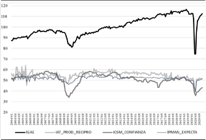 A continuación se revisan las variables que construyen la parte metodológica y empírica del estudio. El primer parámetro se refiere al Indicador Global de la Actividad Económica (IGAE), publicado mensualmente por el INEGI como una medición del desempeño de la industria manufacturera, ya que permite conocer y dar seguimiento a la evolución mensual del sector real de la economía en cuanto a la producción nacional. La propuesta que se hace en este trabajo es contrastar el desempeño industrial manufacturero a través de indicadores de CS, en este caso sectorial.