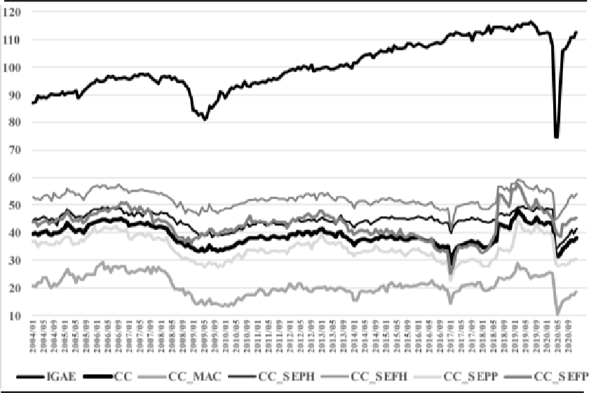 Es necesario aclarar que estos indicadores son construidos a partir de la escala de 0 a 100, donde al reportarse al menos 50 puntos, se sugiere que hay optimismo entre los empresarios y consumidores. Cuando las respuestas se sitúan debajo del umbral de 50 puntos, se asume que hay pesimismo en la comunidad industrial y social respecto a los agentes involucrados. En el Cuadro 5 se muestran los promedios de cada variable, así como su crecimiento medio en el periodo consultado. Podemos añadir que el IGAE se mantiene por arriba de su base 100 y los indicadores agrupados del CSS están en el nivel optimista. Sin embargo, el crecimiento promedio mensual de los últimos 16 años es muy débil, inclusive negativo.