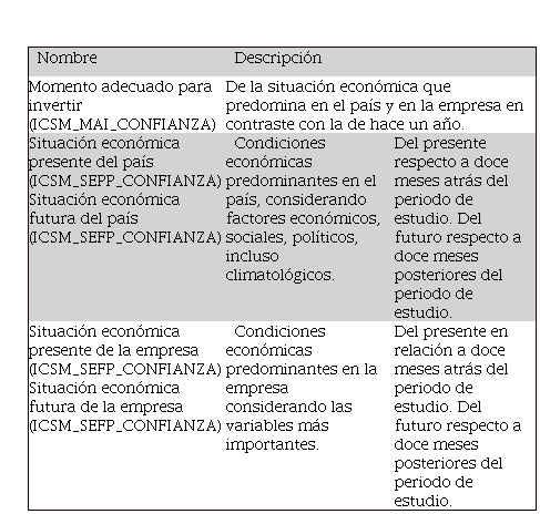Igualmente, utilizamos indicadores de la encuesta mensual de opinión empresarial (EMOE) como elementos directos del Capital Social Sectorial (CSS), lo que nos permite contar con la información casi inmediatamente después de terminado el mes de referencia. El indicador de confianza de la industria manufacturera (ICSM) se considera compuesto, ya que resulta de promediar cinco indicadores simples, los cuales se muestran en el Cuadro 1.
