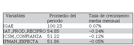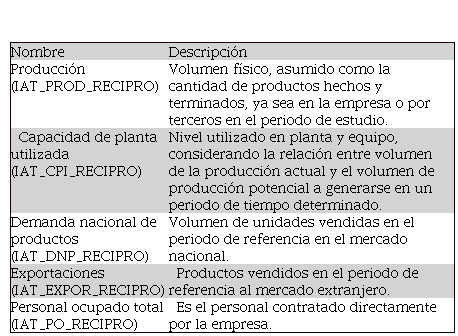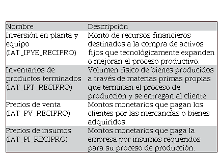 De igual forma, el indicador agregado de tendencias (IAT), constituido por la opinión de los directivos empresariales sobre la “situación que presentan las principales variables de actividad” del sector en estudio que utilizamos como el efecto de reciprocidad, es el promedio ponderado de dichos indicadores a través de resultados expandidos de las respuestas a subindicadores del Cuadro 2.