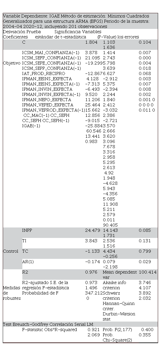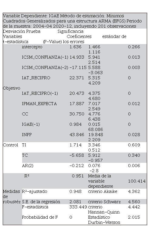 IGAEt=β1+β2ΔCONFIANZAt-k+β3ΔRECIPROCIDADt-k+β4 ΔEXPECTATIVASt-k+β5ΔCCt+β6IGAEt-1+δ1ΔTIt+δ2ΔTCt+δ3 ΔINPPt+εt (1)