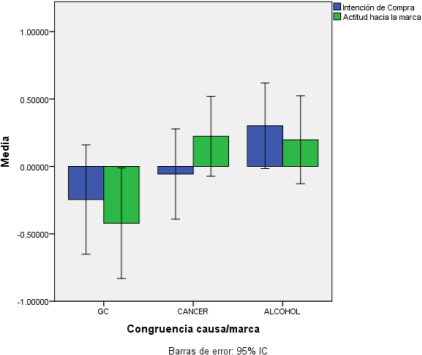 Finalmente, la Gráfica 1 muestra la relación entre las variables dependientes y la media de los grupos experimentales y de control. En él se observa que, frente al grupo de control, la media de los grupos de marketing con causa alta y baja congruencia causa/marca es mayor en ambas variables dependientes: Intención de compra y Actitud hacia la marca (congruente con las hipótesis 1 y 2). Asimismo, en la Gráfica 1 también podemos observar que pertenecer al grupo de alta congruencia causa/marca (cáncer) incrementa las conductas actitudinales, pero no las de comportamiento. Es decir, incrementa la actitud positiva hacia la marca, no así la intención de compra; mientras que, formar parte del grupo de baja congruencia causa/marca (alcohol) incrementa la intención de compra y la actitud hacia la marca, aunque en este último caso en menor medida que el grupo de alta congruencia. Estos resultados son congruentes con la hipótesis 3, que sugiere que frente a cualquier otro grupo, el marketing con causa de alta congruencia causa/ marca favorecerá más la actitud hacia la marca; y opuestos a la H4, que sugiere que frente a cualquier otro grupo, el marketing con causa de alta congruencia causa/marca incrementará en mayor medida la intención de compra.