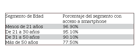 Finalmente, la conveniencia de esta muestra también se ve reflejada cuando se compara con los segmentos de mayor acceso a teléfonos inteligentes. De acuerdo con las cifras del INEGI (2019), en México hay 69.6 millones de usuarios de smartphones. Un análisis del porcentaje de acceso a smartphones por segmentos de edades muestra que prácticamente la totalidad del segmento jóvenes (menores de 30 años) en México son usuarios de éste. Así lo revelan las cifras de Competitive Intelligence Unit (2019) (Cuadro 1).