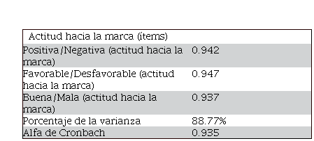 En congruencia con la literatura previa [véanse, por ejemplo, Sabri (2018); Buil et al. (2012); Lii y Lee (2012) y Lafferty y Goldsmith (2005), entre otros], para medir la actitud hacia la marca se empleó una escala de diferencial semántico. Concretamente, se emplearon tres ítems de siete puntos extraídos de la escala de Lafferty y Goldsmith (2005), que propone las siguientes parejas de atributos bipolares: negativa/positiva, desfavorable/favorable, y mala/buena. Para construir la variable con las respuestas obtenidas se realizó un análisis factorial exploratorio. Los resultados indican que los ítems y la muestra empleados son apropiados para medir la actitud hacia la marca. Así lo muestra el test de esfericidad de Bartlett (p = 0.000), que prueba que los ítems están correlacionados entre sí y, por tanto, en su conjunto explican la intención de compra; y el KMO que revela que la muestra fue adecuada (0.769). El método de extracción empleado fue el de componentes principales, mientras que la rotación fue ortogonal (varimax). En el Cuadro 2 se muestra que la medida de la variable actitud hacia la marca es bastante robusta, con un autovalor de 2.663 y una proporción de la varianza de 88%. Por último,se evaluó la fiabilidad del componente mediante el alfa de Cronbach. Los resultados indican que, si se aplicaran los mismos tres ítems a otro grupo de participantes, éstos estarían midiendo de nuevo la intención de compra (0.935).