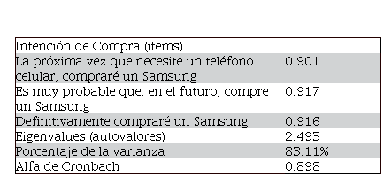 Con las respuestas obtenidas se construyó la variable de interés. Para ello se realizó un análisis factorial exploratorio. Los resultados indican que los ítems y la muestra empleados son apropiados para medir la intención de compra. Así lo muestra el test de esfericidad de Bart- lett (p = 0.000), que prueba que los ítems están correlacionados entre sí y, por tanto, en su conjunto explican la intención de compra; y el KMO, que revela que la muestra fue adecuada (0.751). El método de extracción empleado fue el de componentes principales, mientras que la rotación fue ortogonal (varimax). En el Cuadro 3 se muestra que la medida de la variable intención de compra es bastante robusta, con un autovalor de 2.493 y una proporción de la varianza de 83%. Por último, se evaluó la fiabilidad del componente mediante el alfa de Cronbach. Los resultados indican que, si se aplicaran los mismos tres ítems a otro grupo de participantes, éstos estarían midiendo de nuevo la intención de compra (0.898).