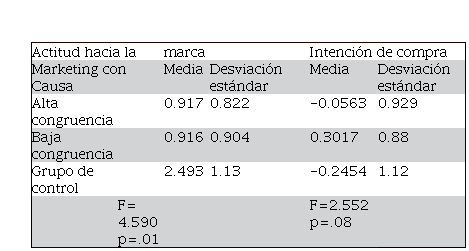 Los resultados de MANOVA indican que el marketing con causa (tanto de alta como baja congruencia) y el grupo de control difieren respecto a la combinación de las variables dependientes intención de compra y actitud hacia la marca. Los test muestran que MANOVA es significativo (V = 0.136, F(4,186) = 3.404, p = 0.010 ; Λ= 0.868, F(4,184)= 3.387,p = 0.011, lo que indica diferencias sistemáticas en las variables resultado a través de las diferentes condiciones experimentales; esto es, un efecto significativo del marketing con causa (tanto de alta como baja congruencia) sobre la intención de compra y la actitud hacia la marca.