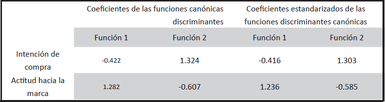 El Cuadro 5 presenta los coeficientes (estandarizados y no estandarizados) de las dos funciones. Éstos se examinan para interpretar el significado de cada función (Huberty y Olejnik, 2006). En este contexto, las dimensiones son Actitud hacia la marca e Intención de compra. La primera función discriminante es representada principalmente por la Actitud hacia la marca (1.282). Mientras que la segunda función es representada principalmente por Intención de compra (1.324).