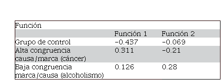 Con la finalidad de examinar las relaciones multivariantes entre las variables dependientes y la variable independiente, se estimó un análisis discriminante. En este caso, el modelo evalúa si la combinación de intención de compra y actitud hacia la marca discrimina entre el marketing con causa de alta congruencia marca-causa, el marketing con causa de baja congruencia marca-causa y el grupo de control.