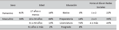 En total se obtuvieron 150 encuestas de las cuales se eliminaron 50 por presentar valores perdidos. El perfil de los encuestados correspondió a un total de 61% mujeres y 39% hombres, mayormente entre los 18 y 30 años (69%) (véase cuadro 1). La conveniencia de esta muestra destaca al comparar este perfil con el del usuario de redes sociales en México. De acuerdo con los datos de la Encuesta Nacional sobre Disponibilidad y Uso de Tecnologías de la Información en los Hogares (ENDUTIH, 2019); en México, aproximadamente 71 millones de personas son usuarios de redes sociales y, de ellos, 57.4% son menores de 34 años.
