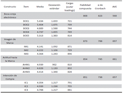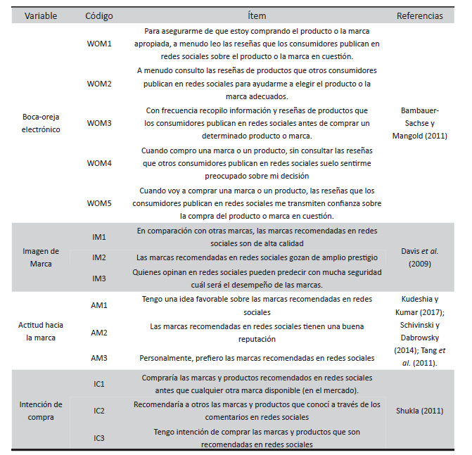 Para medir el boca-oreja se usaron cinco ítems obtenidos de la escala sugerida por Bambauer-Sachse y Mangold (2011). Por su parte, para medir la imagen de marca se usaron tres ítems obtenidos de la escala de Davis et al. (2009). Mientras que para medir la AHM se emplearon tres ítems extraídos de las escalas propuestas por Kudeshia y Kumar (2017), Schivinski y Dabrowsky (2014) y Tang et al. (2011). Finalmente, para medir la intención de compra se usaron tres ítems obtenidos de la escala de Shukla (2011). En todos los casos se empleó una escala Likert de 7 puntos donde 1 es totalmente en desacuerdo y 7 totalmente de acuerdo (véase cuadro 2).