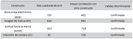 Para evaluar la validez discriminante se empleó el criterio Fornell y Larcker (1981). Éste compara la raíz cuadrada del AVE con las correlaciones de las variables latentes. Para asumir validez discriminante, la raíz cuadrada del AVE de cada variable latente deberá ser mayor que la correlación más alta que se tenga con cualquier otra variable (Hair et al., 2017).
