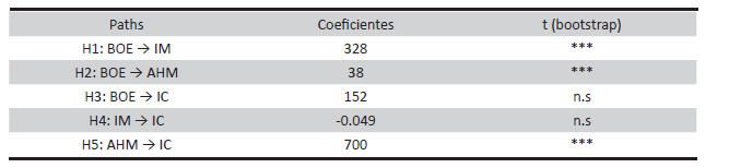 Una vez evaluado exitosamente el modelo de medida, se estimó el modelo estructural para evaluar las hipótesis propuestas (Chin, 1998). Para ello se examinaron: 1) los coeficientes path junto con sus respectivos estadísticos t, 2) el coeficiente de determinación (R2) y 3) el criterio Stone-Geisser (Q2). Los estadísticos t se calcularon a través de la técnica no paramétrica de re-muestreo bootstrapping.