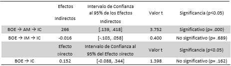Finalmente, se evaluó el papel mediador de imagen de marca y de AHM en la relación entre BOE e intención de compra. La mediación se probó mediante el método de Preacher y Hayes (2004), a través del cual se determina la significancia del efecto indirecto del boca-oreja sobre la intención de compra mediado por la imagen de marca y la AHM.