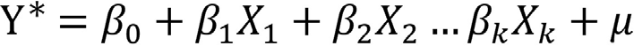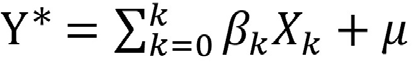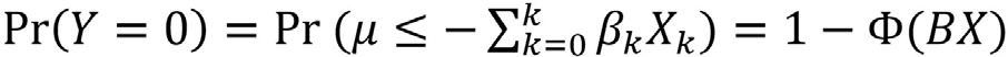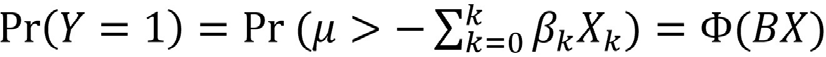 [2]Donde X son variables explicativas, X0=1 representa la constante, y el término de error. Y* no es observada; no hay datos para Y*. El evento Y=1 se puede expresar como una probabilidad cuya distribución está dada por la función de distribución acumulativa de la normal estándar2, que se sintetiza como sigue: