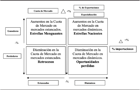 Un valor del índice superior a la unidad indica que el país tiene una ventaja comparativa de carácter positivo a nivel mundial o, en todo caso, al grupo de países referenciados, en tanto que uno inferior sugiere competitividad negativa. Aunque la evidencia estadística presupondría en general una posición relativamente estable de las actividades a través del tiempo, con valores mayores a la unidad para dos tercios de estas en los países desarrollados, la experiencia comercial a partir de los últimos 35 años ha evidenciado que los países emergentes pueden transitar en un número importante de actividades económicas; de valores menores a valores superiores a la unidad, gracias sobre todo a sus políticas de liberalización comercial e integración en bloques regionales, así como su agresividad en los mercados. Por ejemplo, México, después de su ingreso al Acuerdo General sobre Aranceles Aduaneros y Comercio (GATT), en 1986, posteriormente al TLCAN. En el análisis que se presenta en la figura 1, el IVCR se liga con la matriz de competitividad implícita en el software TradeCAN de la CEPAL.