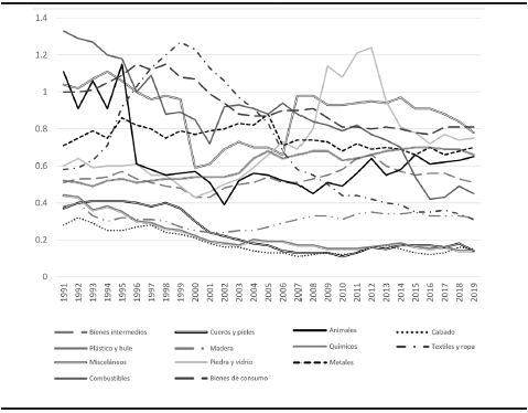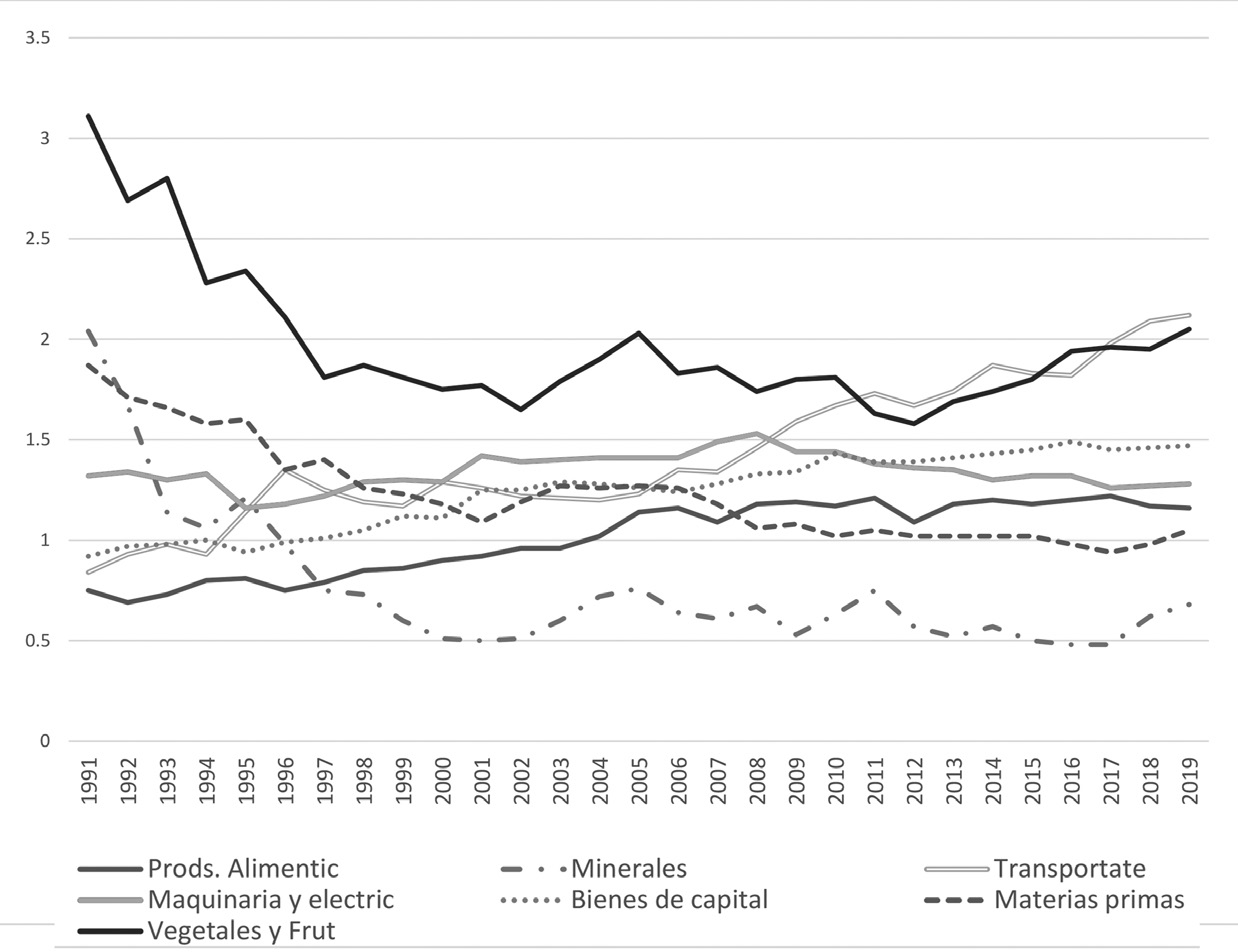 A partir de 2002, una vez concluida la así llamada crisis de las Tecnologías de la Información y la Comunicación (TIC) que padeció EUA durante todo 2001 y se extendió en México hasta el primer trimestre de 2002 (Gutiérrez Rodríguez, 2004), las siete actividades de la gráfica 2 mostraron una recuperación evidente, aunque en el caso de los Minerales el IVCR alcanzó en 2019 un valor de apenas 0.68. El resto sobrepasa desde hace 15 años la unidad, siendo excepcionales tres casos: Transportes, en que se inscribe la industria automotriz; Vegetales y frutas, gracias especialmente al aguacate, el tomate rojo y las frutillas, y Bienes de capital, en que destacan los tractores de carretera para semirremolques, las turbinas y el equipo pesado.