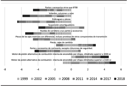 En cuanto a los insumos para la industria, desde fines del siglo XX muchos se importan de EUA, lo que provoca una relación saldo comercial/comercio total negativa, como muestra la gráfica 4. En especial, destacan Partes y accesorios, Volantes, columnas y cajas; Embragues y piezas; Suspensiones y amortiguadores; Ruedas de carretera y sus partes y accesorios. Esto es congruente con una actividad líder de la maquila mexicana de exportación, que debe cumplir con las reglas de contenido regional del TLCAN/ T-MEC.