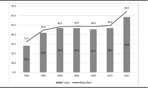 La grafica 5 presenta la evolución en términos porcentuales del IGLPP total y manufacturero México-EUA en el periodo 1990-2021. Descomponiendo en tres subperiodos, uno hasta 2000, otro de 2000 a 2015 y un tercero de 2015 a 2021, queda claro que en el primero se pasó de un valor promedio ponderado del total de productos comercializados de 28.21% a 46.93%, y del de productos manufactureros de 32.29% a 48.29%. En el segundo periodo ambos índices se estabilizaron, con variaciones de un punto porcentual hacia arriba (manufacturas) o hacia abajo (total de productos). En el tercero, el IGLPP total subió a 58.6% y el IGLPP manufacturero a 64.51%, lo que se explica por el enorme impulso que significó para las exportaciones totales y manufactureras de México la transición de la ralentización económica impuesta en 2020 por la pandemia de la Covid-19 a la recuperación en 2021. Estudios econométricos llevados a cabo en Gutiérrez Rodríguez (2012: 199-232) muestran que a medida que aumentan las exportaciones manufactureras de México a EUA, se incrementan su saldo comercial y su IGL; es decir, que sube el nivel de integración de las industrias a ambos lados de la frontera.