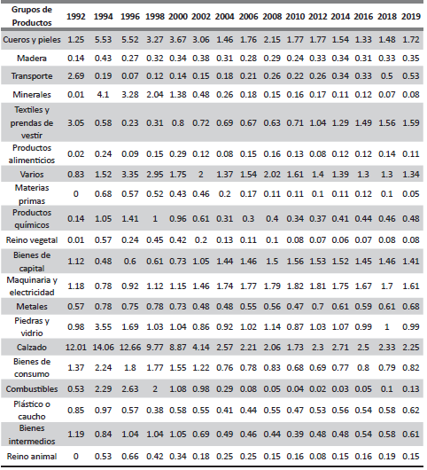 Respecto al comercio de México con China, en general se exportan bienes primarios e importan bienes de consumo e insumos intermedios, aunque en el sector manufacturero el intercambio también se da en la dirección México-China. El alto nivel favorable a México que se observa en el coeficiente saldo comercial/comercio total de Minerales se debe a que generalmente sólo hay movimientos de ida, como son los casos del hierro, el cobre y el plomo (esto da lugar a un valor de 1), en algunos años no se comercia nada (valor de cero). En otro caso, se ha pasado de importar antimonio sin exportarlo (valor de -1) a sólo exportarlo o no comercializarlo (valores de 1 y 0, respectivamente). Es decir que en esta actividad el comercio ha sido unidireccional, dada la necesidad de materias primas de China (con base en World Bank/UNCTAD/ UNSD/WTO, 2021).