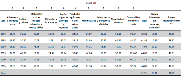 En la sección 7 está contenida la industria del Transportes, que incluye todo tipo de vehículos terminados y sus partes: de carretera (autos, camionetas, tractocamiones), ferrocarriles, lanchas, helicópteros y una gran variedad de motores de combustión interna. Asimismo, aparece una gama de maquinaria eléctrica, electrónica y manual, para el hogar, la industria y el campo, en especial línea blanca, pantallas de televisor y equipo de cómputo. Incluso, está contenida la industria textil. En seguida destacan productos de uso personal, como ropa de vestir para hombre y mujer; productos para el hogar, como lámparas, muebles, colchones; complementos de la industria del transporte terrestre, marítimo y aéreo, como asientos y radiadores; y productos científicos, de precisión y de difusión, como microscopios, equipo fotográfico y proyectores. Las commodities no incluidas en otras partes (sección 9) constituyen un grupo sobrante y poco significativo para la producción, que incluye el comercio de metales preciosos y joyería. Al agrupar a las secciones entre intensivas en recursos naturales (0 a 3) e intensivas en bienes manufactureros (4 a 8), se corrobora la vocación manufacturera de México, con un ICII de 49.55% en 2015 y 63.99% en 2021, mientras los intensivos en recursos naturales llegan a 22.45% en 2015. Es decir que, en materia de Alimentos y animales vivos, Bebidas y tabaco, Materiales crudos, y Minerales y lubricantes, el comercio México-EUA es en más de 70% en promedio (complemento del IGL) de una sola dirección: o se exporta o se importa.