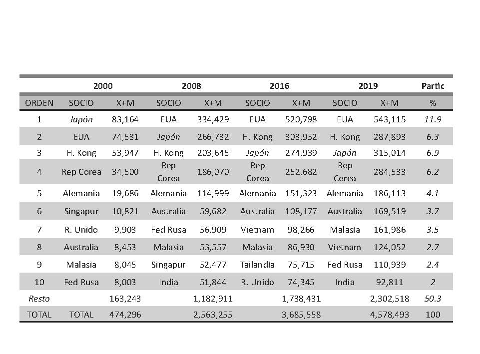 Contrario a lo que sucede en otras regiones, excepto EUA, los principales socios comerciales de China (suma de exportaciones más importaciones) son de Asia, como muestra el cuadro 4, lo que evidencia un alto nivel de comercio intrarregional: Hong-Kong, Japón, República de Corea, Singapur, Malasia y Australia. México se situaba en los años noventa entre sus 30 principales socios, y actualmente está entre los 15 primeros (si sólo se consideran sus exportaciones, baja mucho); por tanto, no figura en el cuadro. Los cuatro primeros socios de la lista en 2019 (EUA, Hong Kong, Japón y República de Corea) representan casi 70% del comercio del grupo de 10, aunque la cifra baja a 31.3% si se considera el total de socios comerciales, es decir el total mundial.