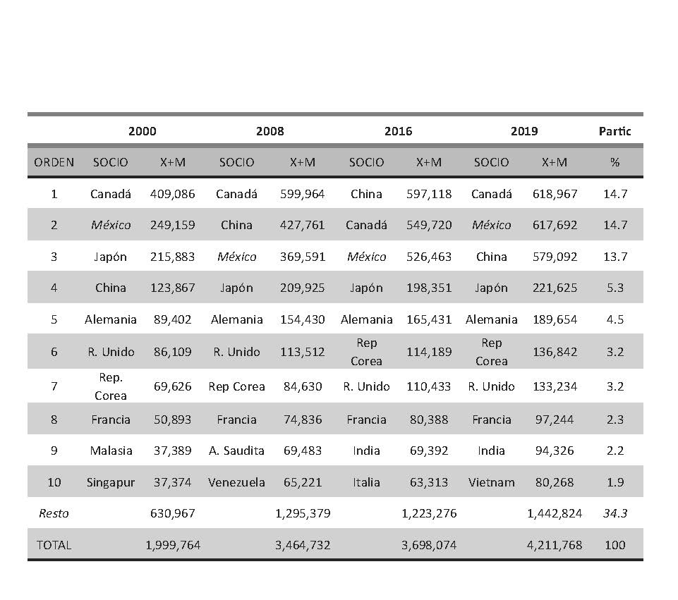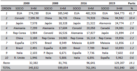 Como muestra el cuadro 3, en el que se ilustra la dinámica de los 10 principales socios comerciales de México entre 2000 y 2019, el que se sitúa al principio es, con mucho, EUA. Canadá, que gracias al TLCAN se había constituido en el segundo, descendió hasta la quinta posición en 2008, superado por China, Japón y Alemania, al tiempo que China saltó desde el sexto hasta el segundo, para no abandonar esa posición. Esto a pesar de que no todas las exportaciones chinas a México llegaban ahí para quedarse, sino que buscaban el mercado estadounidense, particularmente en el caso de insumos intermedios para industrias como la automotriz, de autopartes, eléctrica y electrónica. Es decir, se apreciaba triangulación comercial (Gutiérrez Rodríguez y González Guzmán, 2021).
