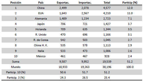 Una característica sobresaliente de los tres países es su posición en el valor de los flujos comerciales; se trata de los lugares primero, segundo y décimo en términos de exportaciones más importaciones de mercancías, valor que representa un poco más de la cuarta parte del total mundial, como muestra el último renglón del cuadro 1. En el grupo aparecen siete países más, que al sumarse a los primeros tres, representan la mitad de los flujos comerciales internacionales.