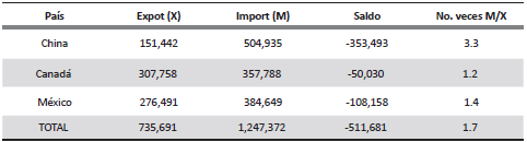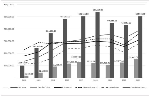 El saldo de la balanza comercial de México es diferente con cada socio: de acuerdo con cifras del United States Census (2022), con EUA tuvo en 2021 un superávit de 108 mil millones de dólares y, de acuerdo con Banxico (2022), con China registró un déficit de 91.7 miles de millones (esta misma fuente registró un superávit con EUA de 178 mil millones de dólares, lo que aun así significa que la mitad de éste sirve para cubrir el déficit con China). El primer saldo se explica por el posicionamiento que ha logrado México como oferente significativo de productos manufactureros en el marco del TLCAN/T-MEC y en un gran número de industrias con alto IVCR; es decir, frente a EUA México exporta mucho y tiene un amplio número de productos en que es competitivo. El déficit con China se expande a partir de la adhesión de dicho país a la OMC, en 2001, cuando gracias a los beneficios del libre comercio, a su eficiencia productiva y a los bajos costos de su mano de obra, se posicionó como el primer exportador hacia EUA, por arriba de Canadá y México, con un superávit bilateral en 2021 de 353.5 mil millones de dólares. Además, parece gravitar una posible triangulación comercial China-México-EUA.