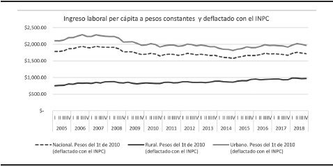 CONEVAL (2022), publica datos del poder adquisitivo del ingreso laboral real (PAIPCR), en estos datos se pueden ver que las zonas urbanas muestran un PAIPCR más elevado relativamente al de las zonas rurales, de casi 3 veces. La gráfica 1, muestra estos datos de 2005 a 2018, se aprecia que el PAIPCR ha disminuido particularmente el de la PEA urbana, tuvo su nivel más alto entre 2006 y 2007 y su nivel más bajo a finales de 2014, después de 2014 subió ligeramente, pero no recuperó los niveles alcanzados en 2006.