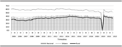 Lo importante ahora es ver el porcentaje de la población con ingreso laboral inferior al costo de la canasta alimentaria nacional (gráfica 2), el mayor porcentaje se ubicó en el segundo trimestre de 2020. En general, el porcentaje de personas con un ingreso inferior al costo de la canasta básica es muy alto, el urbano está cerca de 60% promedio de la población y el rural cerca de 35% promedio de la población