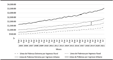 En la gráfica 4 se puede apreciar las líneas de pobreza por ingresos6 y las líneas de pobreza extrema por ingresos7, que han aumentado mensualmente. La línea de pobreza urbana ha tenido un aumento de 2,000 pesos de 2005 a 2021, considerando el ingreso laboral en el ámbito urbano las personas después comprar la canasta alimentaria se quedan sin ingreso laboral.