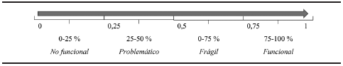 Una persona puede estar en una zona de fragilidad (75-50%), una zona grave (50-25%) y una zona claramente disfuncional o patológica (25-0%). Un ejemplo permite dejar esto claro. Una persona que sólo reconocería ser responsable de lo que realmente cometió de vez en cuando (menos de 50%) no funciona en una empresa (institución pública/privada o empresa (pública/privada). De la misma manera quien no es capaz de proyectarse a futuro y ser fiel a lo que se comprometió más del 50% de las veces constituye un problema para una empresa. Así es como se propone la escala siguiente (cuantitativa/cualitativa) para leer los resultados obtenidos.