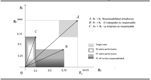 En la gráfica anterior el eje horizontal representa la responsabilidad del trabajador RT y en el eje vertical la responsabilidad en el contexto laboral marcado con RF. Se puede observar 4 posibles situaciones. En el punto C, el RF es responsable por arriba de 0.75, en el punto D, el RF no es responsable por debajo de 0.75. En el punto B, el RT es responsable por arriba de 0.75, dentro del rectángulo D, por debajo de 0.75 no es responsable. Solo dentro del cuadrado amarillo se puede decir que existe responsabilidad de RT y RF, alcanzando su punto máximo en A.