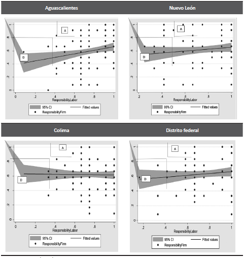 Finalmente, entre los tres tipos de responsabilidad, la más baja es la responsabilidad autrui del contexto laboral, los niveles son incluso más bajos que los de la responsabilidad posterior del trabajador y esto en todos los estados, particularmente para Tamaulipas, Querétaro, Chiapas y Colima. Un caso particular es el de Jalisco que no cuenta con cuatro categorías de responsabilidad.