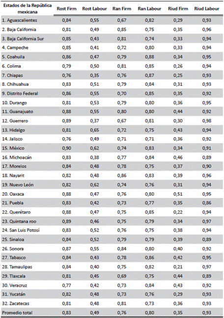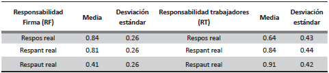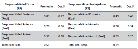 En la tabla 1 se presentan los resultados de responsabilidad promedio nacional en sus tres categorías: Responsabilidad Posterior, Responsabilidad Anterior y Responsabilidad Autrui, tanto del contexto laboral como del trabajador. Aquí se exponen las respuestas de lo que se denomina la responsabilidad ideal y la real. La primera captura el discurso o lo que se desearía que fuera y la real captura lo que es. Entonces solo se describirá la responsabilidad real, al mismo tiempo se puede observar que los resultados son heterogéneos y que sobre todo existe un bajo nivel de responsabilidad autrui del contexto laboral y un bajo nivel de responsabilidad posterior del trabajador. Esta estructura en los niveles de responsabilidad aparece siendo la misma en todos los estados de la República, como se puede ver en la tabla 1delanexo I.