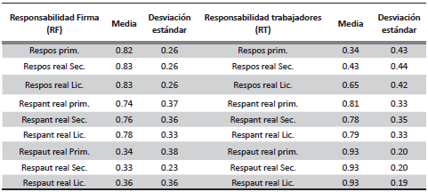 Si solo se toma en cuenta a las personas con nivel primaria y secundaria, se observa que la responsabilidad (RF) posterior y anterior son ligeramente más bajas en relación con los demás trabajadores que tienen mayor formación (Herrera y Díaz, 2018), así como la responsabilidad posterior del trabajador; por lo tanto, es posible decir que el sistema de educación obligatorio no educa para formar individuos responsables.