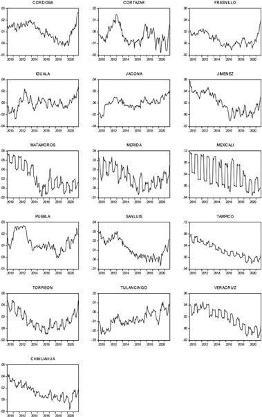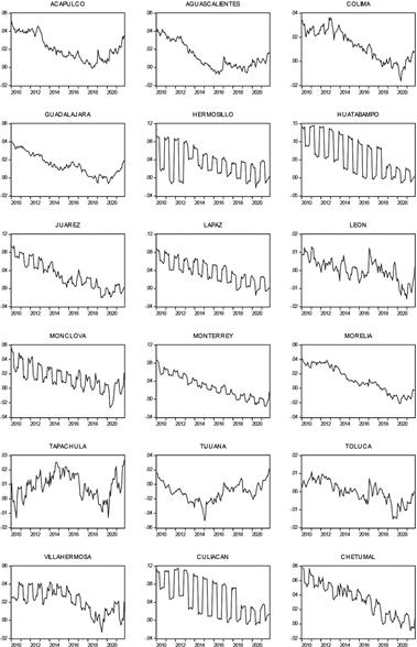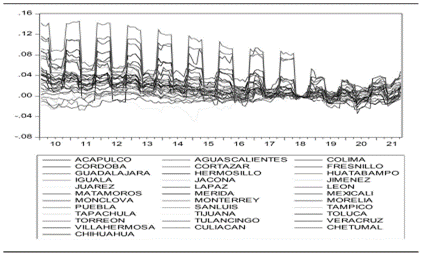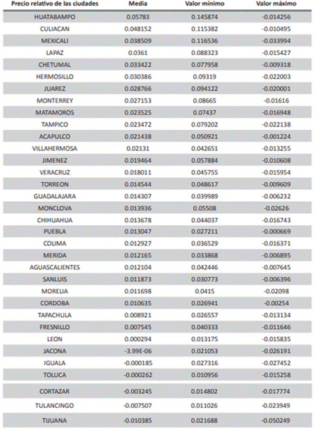 Fuente: Elaboración propia con base al Sistema de Cuentas Nacionales de México, Instituto Nacional de Estadística y geografía (INEGI).Analizando la estadística descriptiva de los precios relativos de las 34 ciudades de México (cuadro 1), las dos ciudades que presentan menor inflación promedio a la de la Ciudad de México son Tijuana (-1.03%) y Tulancingo (-0.75%), mientras que ciudades como Huatabampo (5.7%) y Culiacán (4.8%) son las ciudades que presentan una inflación promedio mayor.