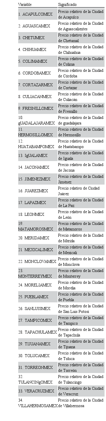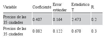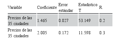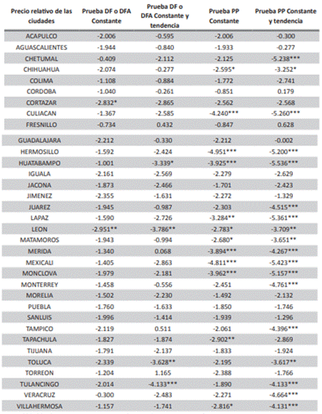 Lo anterior implica el cumplimiento de la paridad relativa intranacional de las 34 ciudades de México, por lo que se podría decir que los mercados internos de cada ciudad analizados, tomando en cuenta los precios relativos a nivel general, están integrados en algún grado con la ciudad numeraria y existe una convergencia de precios en el largo plazo entre las ciudades. Las desviaciones de los precios relativos de las ciudades de su nivel medio son transitorias y tienden a regresar a ese nivel medio o de equilibrio en el largo plazo. La paridad relativa refleja que los precios de las ciudades no son exactamente iguales, pero si están fuertemente relacionados unos de otros.
